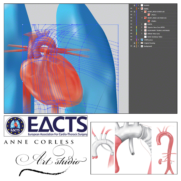 "Anne Corless was commissioned to create complex medical illustrations for EACTS and I was very pleased to collaborate with her. This proved to be easy to do through use of the Cloud, although we were based in different countries, sometimes in very different time zones. At each stage Anne shared the development of the artwork and I was able to review and comment. She was willing to listen to ideas and interpret them visually. The completed dynamic illustrations are backed up by her creative and technical expertise as a medical illustrator with a good knowledge and understanding of anatomy and physiology. EACTS is an international association devoted to the practice of cardio thoracic surgery. Surgeons around the world will enjoy seeing these images."